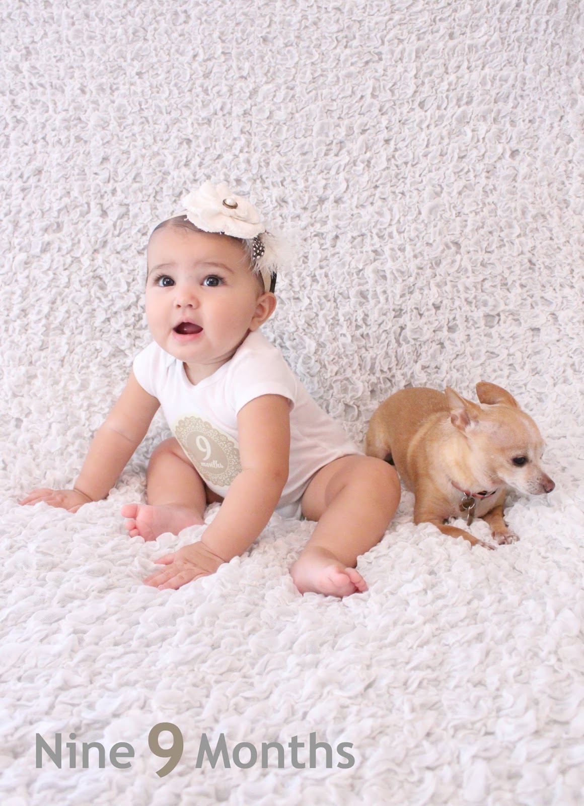 Her little brain seems to be growing every day. She has learned some new tricks this past month. She can officially say "Da da" on command. But she is such a little stinker that if you ask her to say "Ma ma" she will just say "Da da" over and over again. She can give high fives on command, do "Ta-da's" on command and Harlow taught her to howl like a wolf. My most favorite trick that she learned this past month is when you ask her to say hi she will wave her little arm up and down, almost like she is fanning herself.