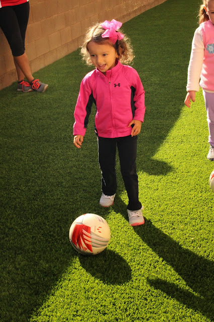 For the past month, Harlow has been playing soccer. When we first approached her with the idea of playing soccer she was totally against it. Arms crossed and a definite, "I don't want to!". But we took her to Frankie's soccer game, bought her a pink soccer ball and took her to the park to try it out a couple of times and finally she agreed! Swim America has a program for kids her age and even younger to learn the fundamentals of soccer. She has been doing great, never shed a tear and is always excited when it's time to go again. That is a complete success in my book since she wanted nothing to do with it in the beginning. Now, if only we could get her to stop using her hands!